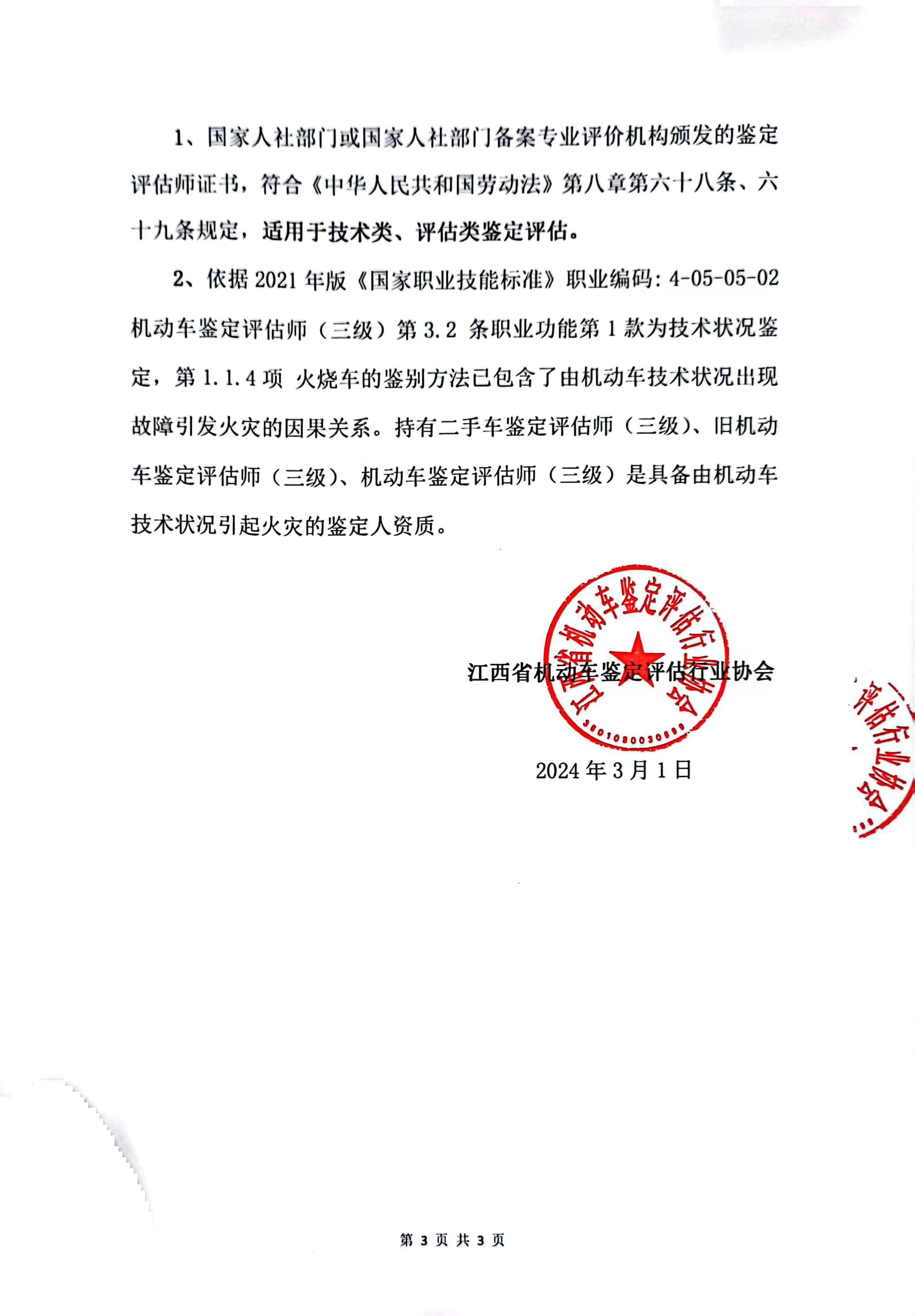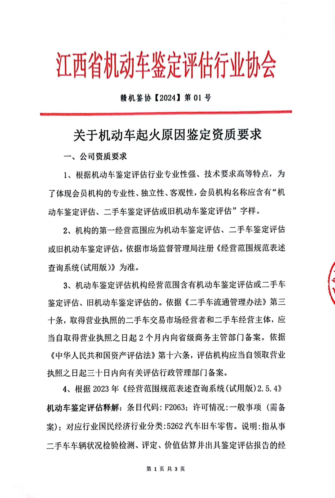 江西省机动车鉴定评估行业协会发布《关于机动车起火原因鉴定资质要求》