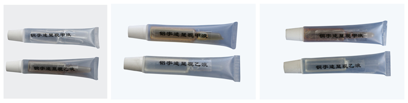 将“钢字迹甲液”点滴在金属表面上,用棉棍在金属表面上涂抹。反复进行点滴、涂抹过程,约在5—30分钟时间内可以看到显现出的字迹,此时加滴“钢字迹乙液”可以使字迹的反差增强。反复交替点滴“钢字迹甲液”和“钢字迹乙液”直至得到较好的效果, 整个显现过程可能持续1小时。